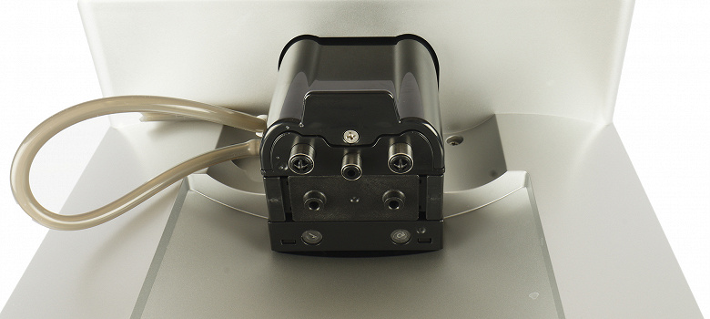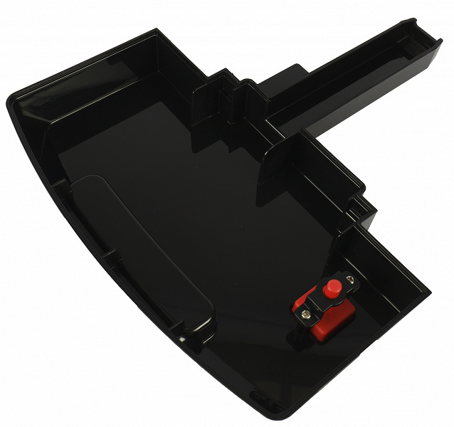Сам бак объемом 1,8 литра сделан из затемненного прозрачного пластика. У бака предусмотрена ручка для переноски (и удобного извлечения). Вода подается через клапан в нижней части. Там же виден поплавок, сигнализирующий о том, что вода заканчивается. В верхней части присутствует отметка максимального уровня заполнения контейнера.