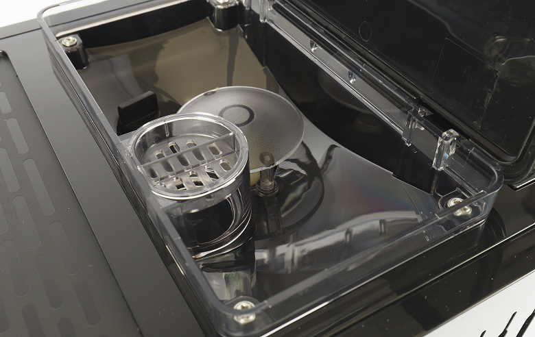 Кофемолку внимательно рассмотреть не получится, однако, на всякий случай, скажем, что в нашей кофемашине используется кофемолка со стальными коническими жерновами — стандартное для подобных машинок решение.