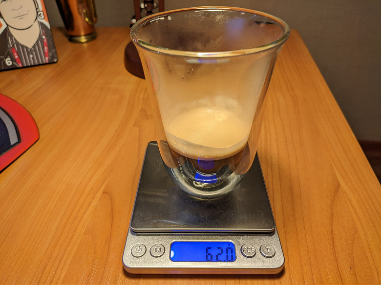 Температура кофе в чашке составит примерно 75 °C, что не могло не сказаться на качестве — субъективно наш напиток мало уступает лунго, который варят более дорогие кофемашины.