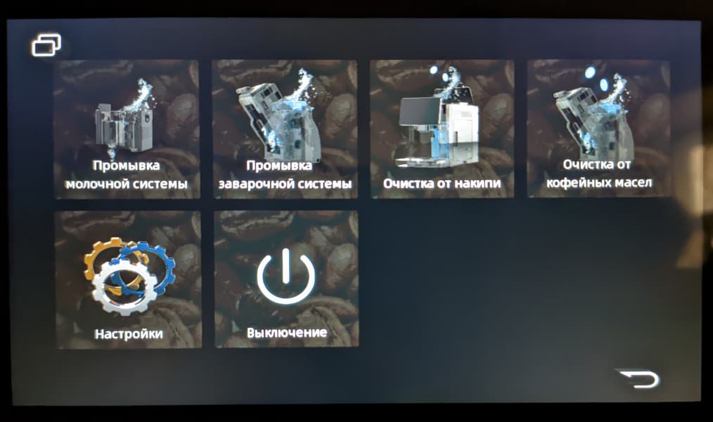 Тут мы можем повлиять на поведение кофемашины в том, что касается работы системы очистки: настроить интервалы декальцинации, отсрочку запуска очистки молочной и заварочной системы, частоту уведомлений о переполнении контейнера отходов и, конечно же, таймер автоматического отключения дисплея.