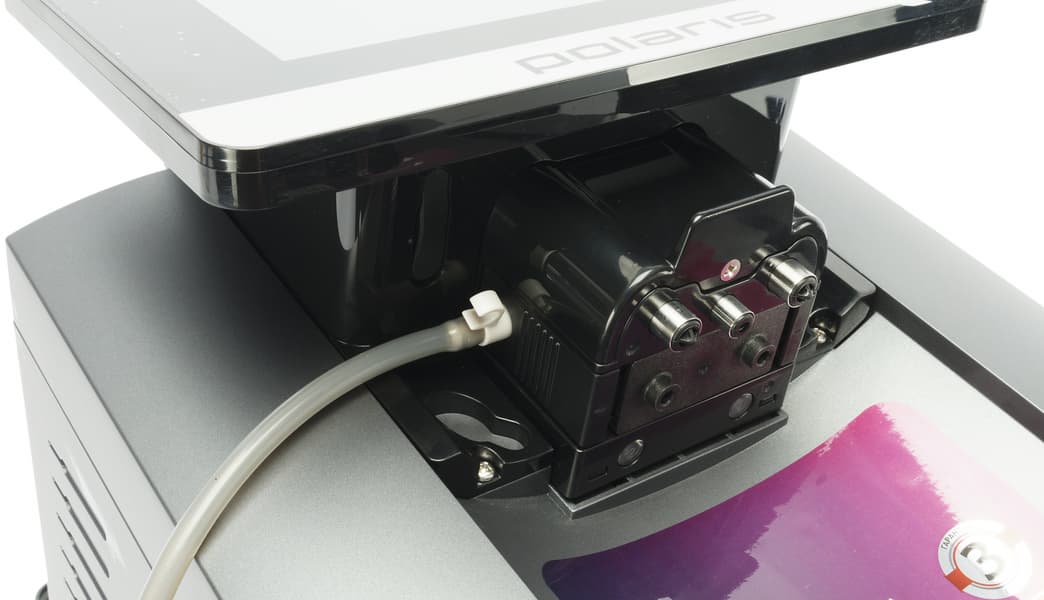 Заварочный блок слегка хлопает и гремит в процессе работы. Реальных неудобств это не доставляет, однако если говорить субъективно, то наш Polaris — это не самый тихий автомат среди представленных на рынке.