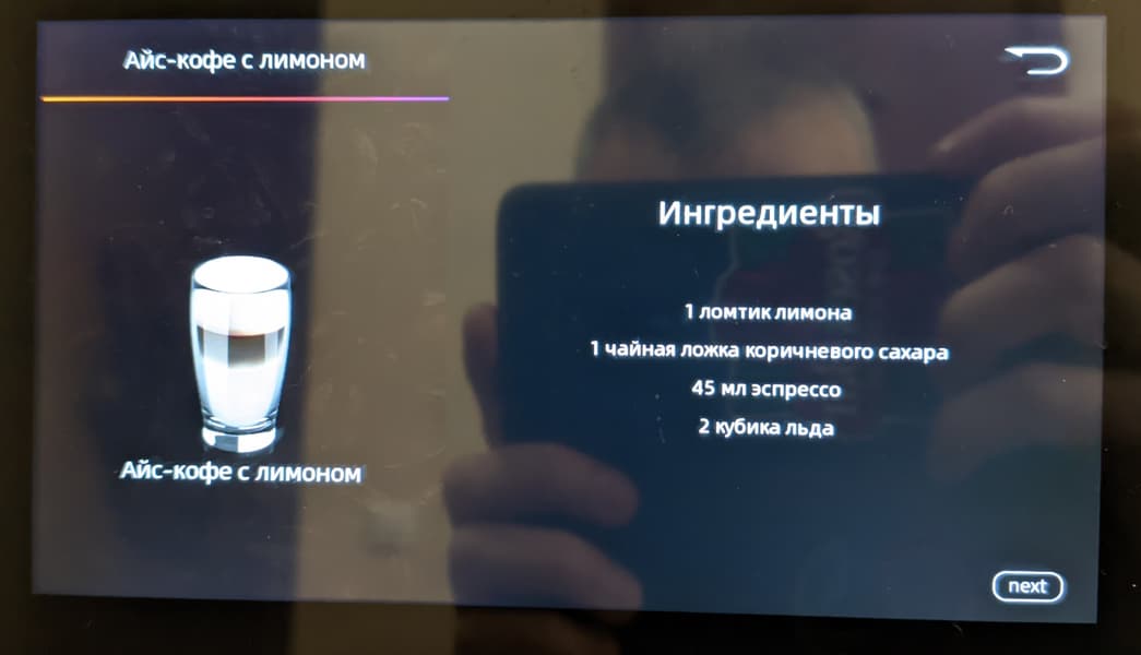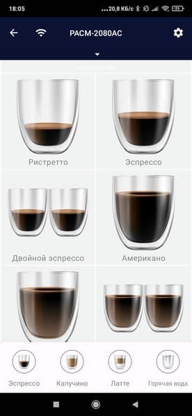 На основных экранах мы можем запустить приготовление любого из имеющихся рецептов, включающих в себя эспрессо, американо и всевозможные молочные напитки.