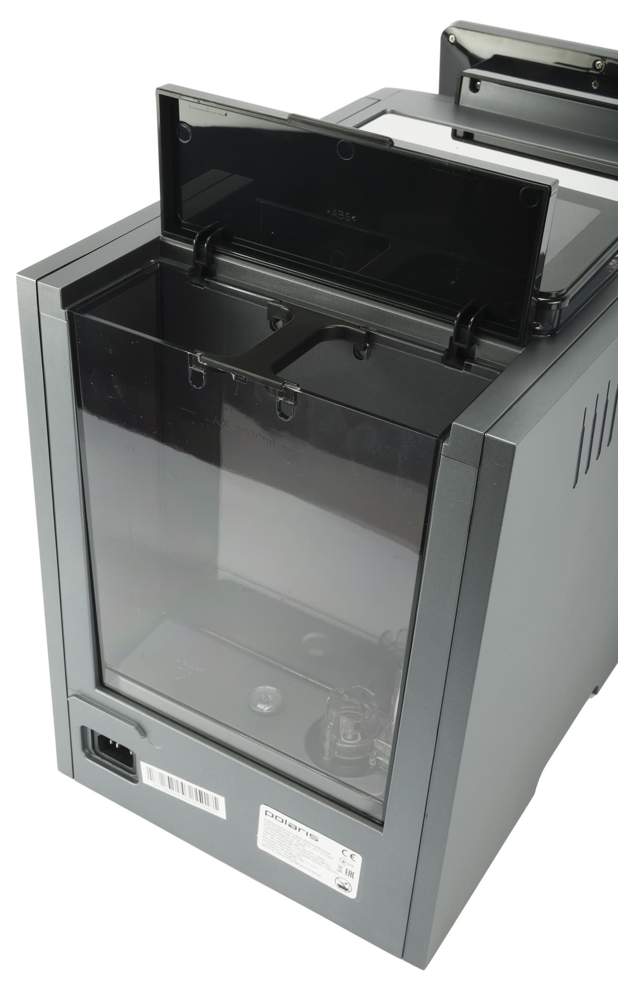 Контейнер для воды объемом 1,8 литра расположен сзади, достается — сзади-сбоку. Контейнер легко, одной рукой, снимается и устанавливается на свое место. Крышка контейнера закреплена на корпусе устройства и откидывается на себя. Если прямо над кофемашиной висят кухонные шкафчики — то поставить прибор вплотную к стене не получится.