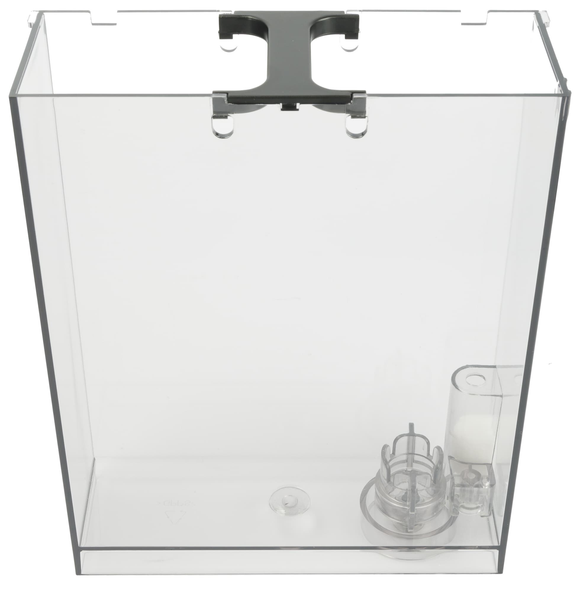 Сам бак объемом 1,8 литра сделан из затемненного прозрачного пластика. У бака предусмотрена ручка для переноски (и извлечения). Вода подается через клапан в нижней части. Там же виден поплавок, сигнализирующий о том, что вода заканчивается. В верхней части присутствует отметка максимального уровня заполнения контейнера, а вот отметки минимального уровня воды нет. Поэтому доливать ее рекомендуется по максимуму.