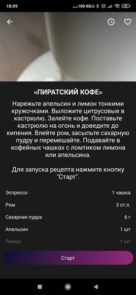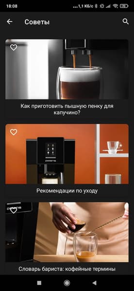 - посмотреть рецепты всевозможных напитков и коктейлей на основе кофе (и сразу же запустить приготовление нужного кофе)