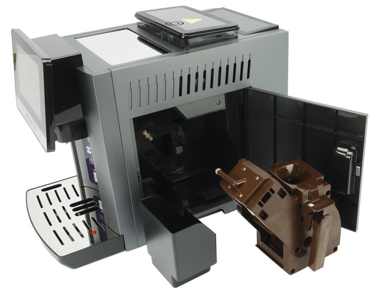 Лючок имеет ручку-защелку и без труда открывается, открывая доступ к заварочному блоку, контейнеру для отработанного кофе и поддону для молотого кофе, просыпавшегося в процессе приготовления.
