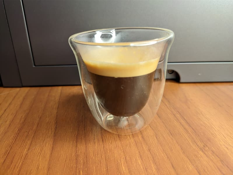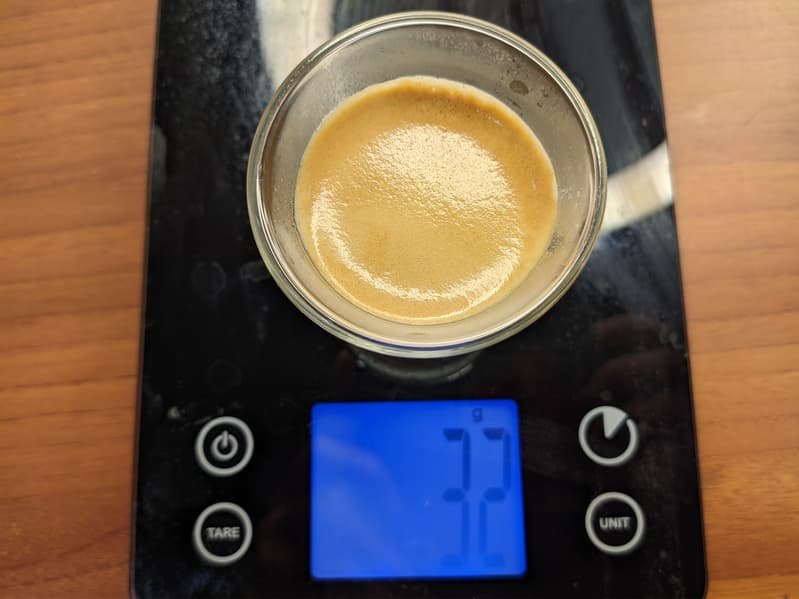 Начали с обычного эспрессо на стандартных настройках. Классический вариант эспрессо наш автомат готовит одним нажатием кнопки. На стандартных настройках машина наливает без малого 32 г напитка.