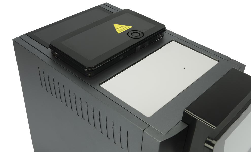 Посмотрим на кофемашину сверху. Тут мы видим крышку отсека для зерен из черного глянцевого пластика и крышку бака для воды (также из черного пластика).