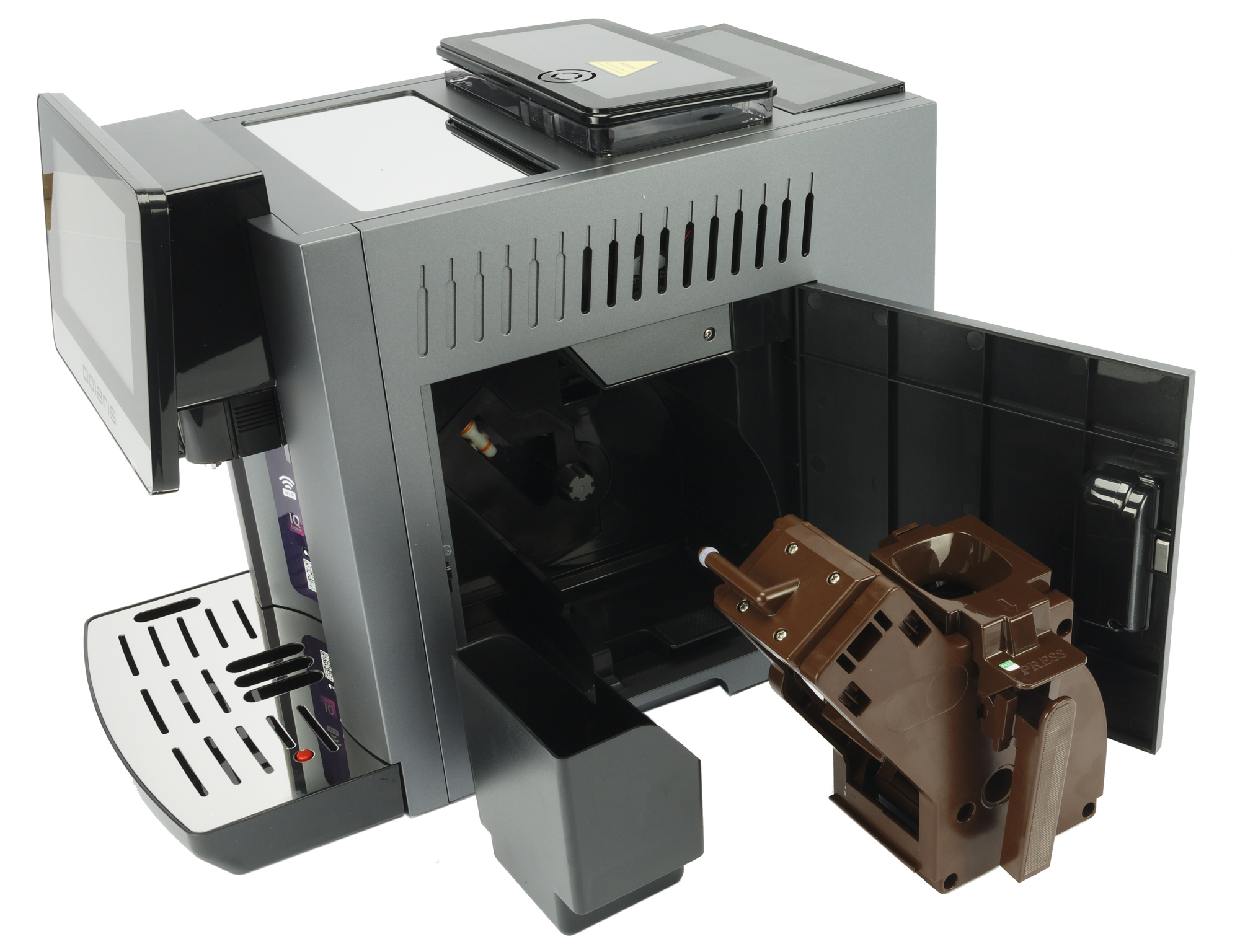 За боковым люком скрывается компактный заварочный блок. Он требует периодического извлечения и очистки. Конструкция блока стандартная для кофемашин Polaris: мы уже встречали его в более бюджетных моделях.