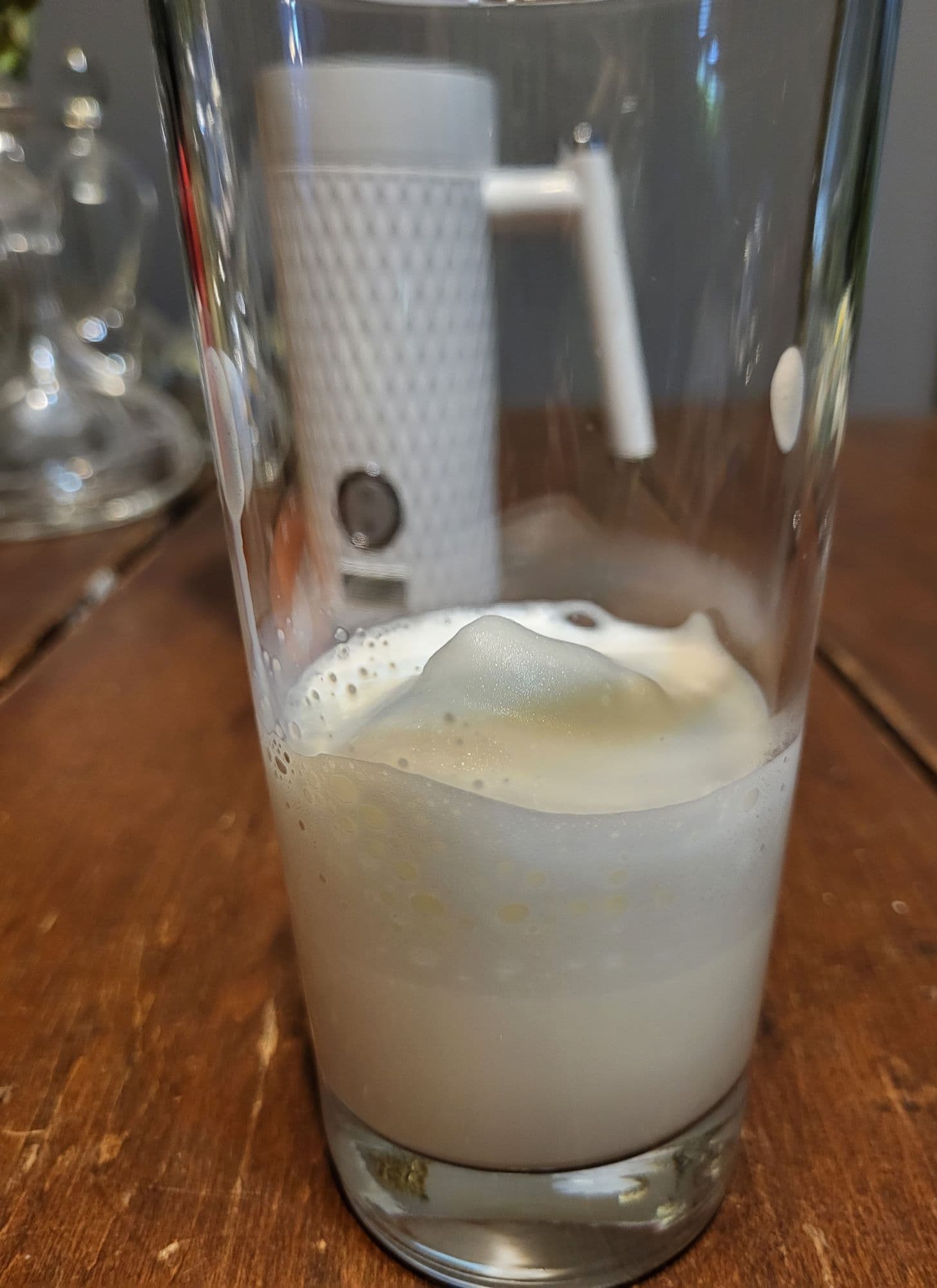 На фото видно, что пена занимает примерно ⅔ общего объема, остальная ⅓ — невзбитое молоко.