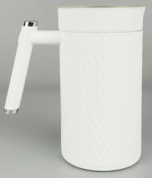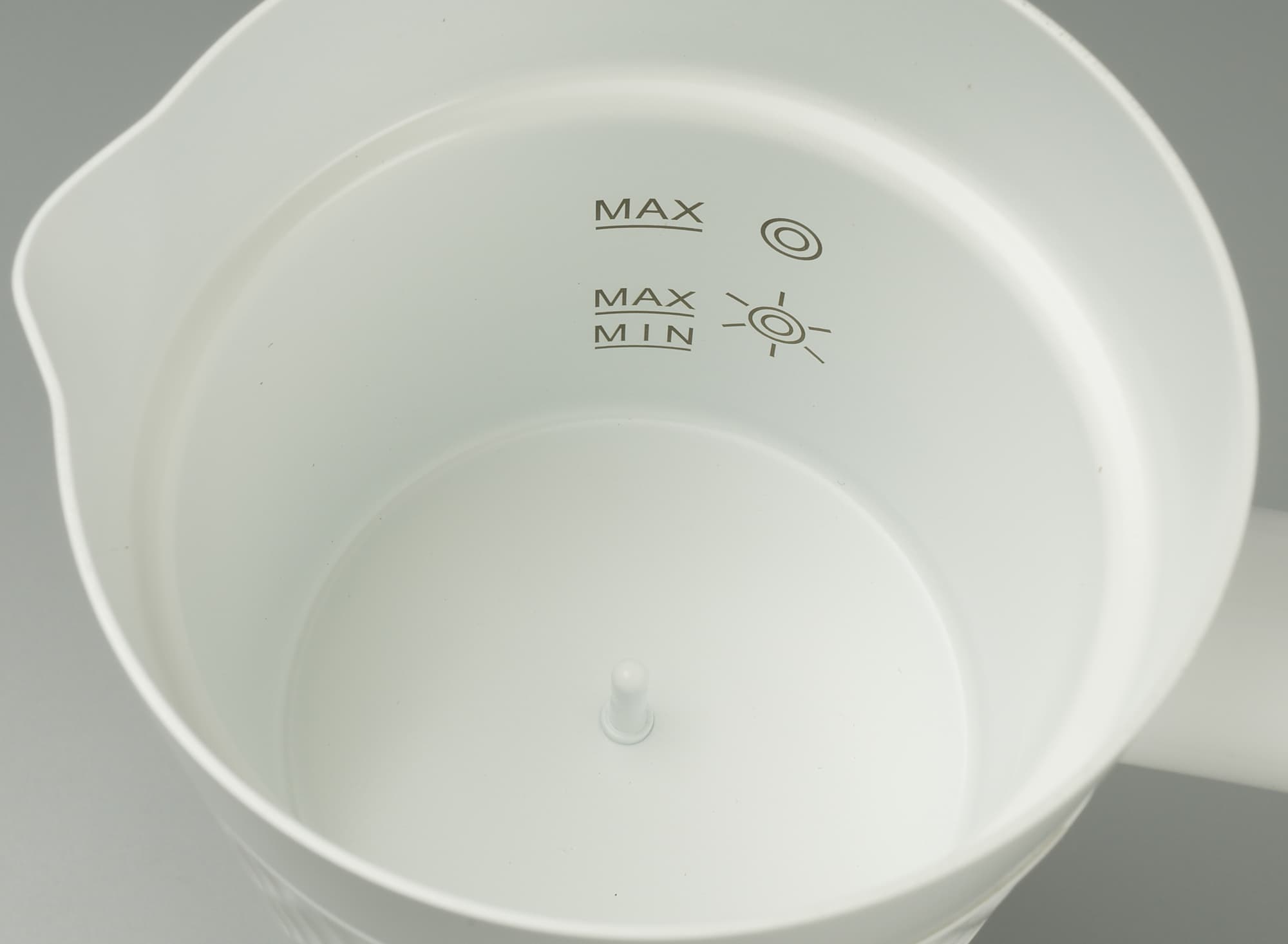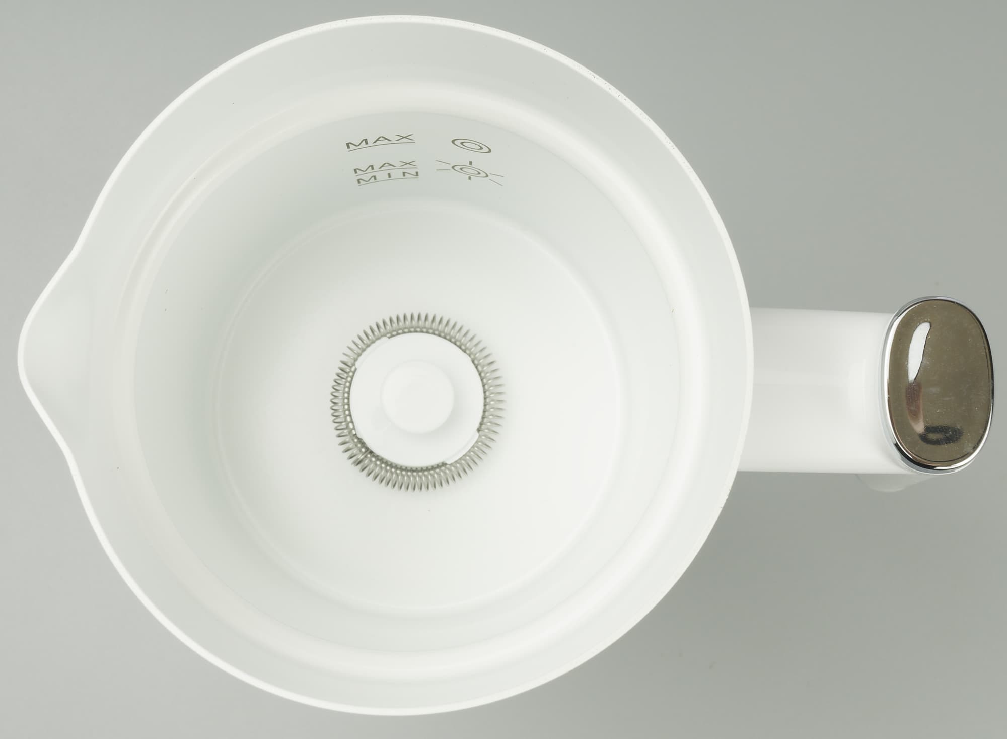 Внутренняя часть вспенивателя металлическая и покрыта антипригарным покрытием. Напротив ручки выделяется небольшой изгиб-носик. На боковых стенках нанесены отметки Max, соответствующие максимальному уровню молока для горячего вспенивания и подогрева молока, и отметка Min для минимального наполнения кувшина.