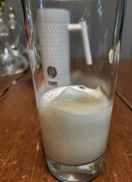 Взбивается неплохо, но, в отличие от горячей пены для капучино, довольно быстро опадает. Возможно, это стоит учитывать, если вы соберетесь готовить коктейль с холодной молочной пеной.