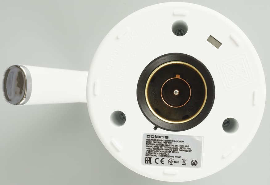 Если вспениватель перевернуть, можно увидеть отверстия для резиновых антискользящих ножек (3 шт.) и наклейку с номером модели. Электрический шнур выходит сбоку, отсека для намотки излишков шнура не предусмотрено.