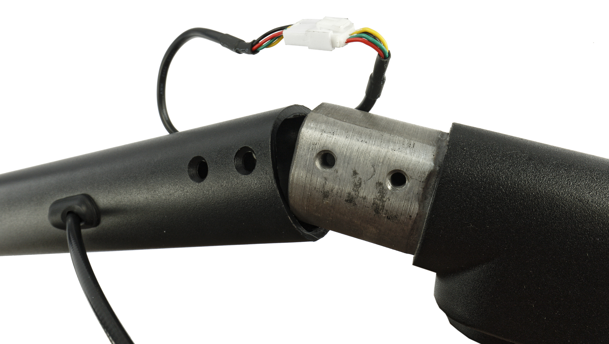 Затем надеваем руль на основание самоката, соединяем провода и устанавливаем винты M5 с помощью шестигранного ключа.