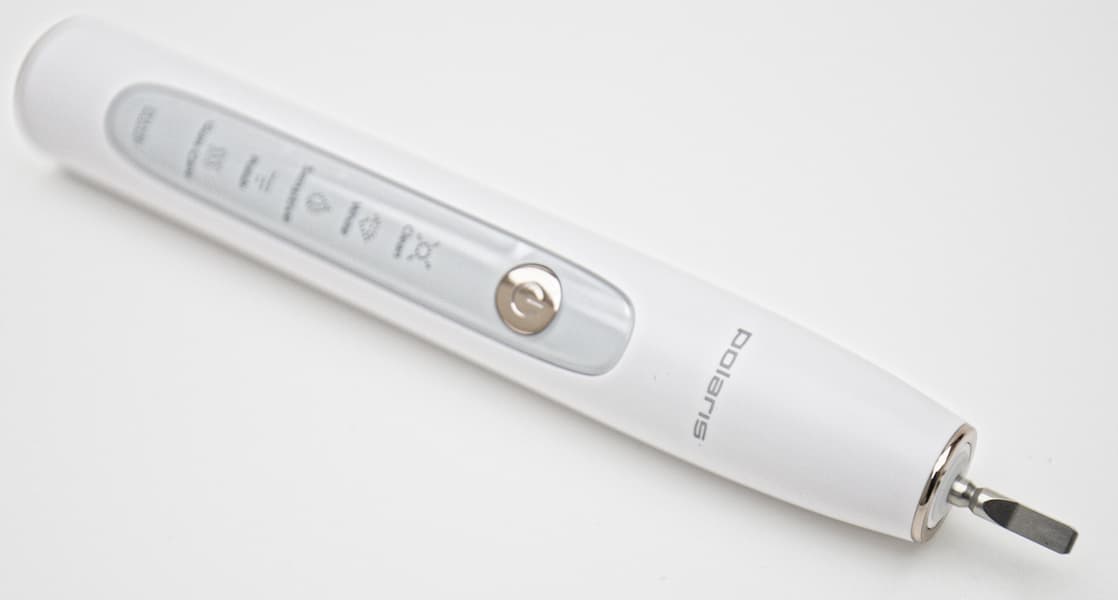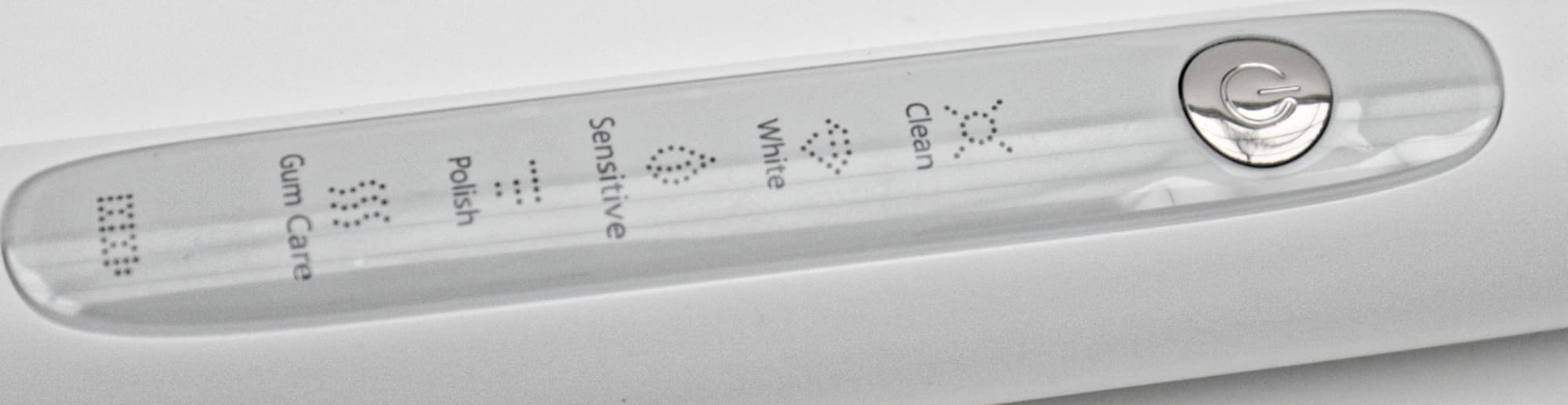 Для включения, переключения режимов и выключения у щетки служит одна достаточно крупная хромированная кнопка — не перепутаешь даже на ощупь. Под ней находятся светодиодные пиктограммы режимов с подписями на английском и значок уровня заряда.