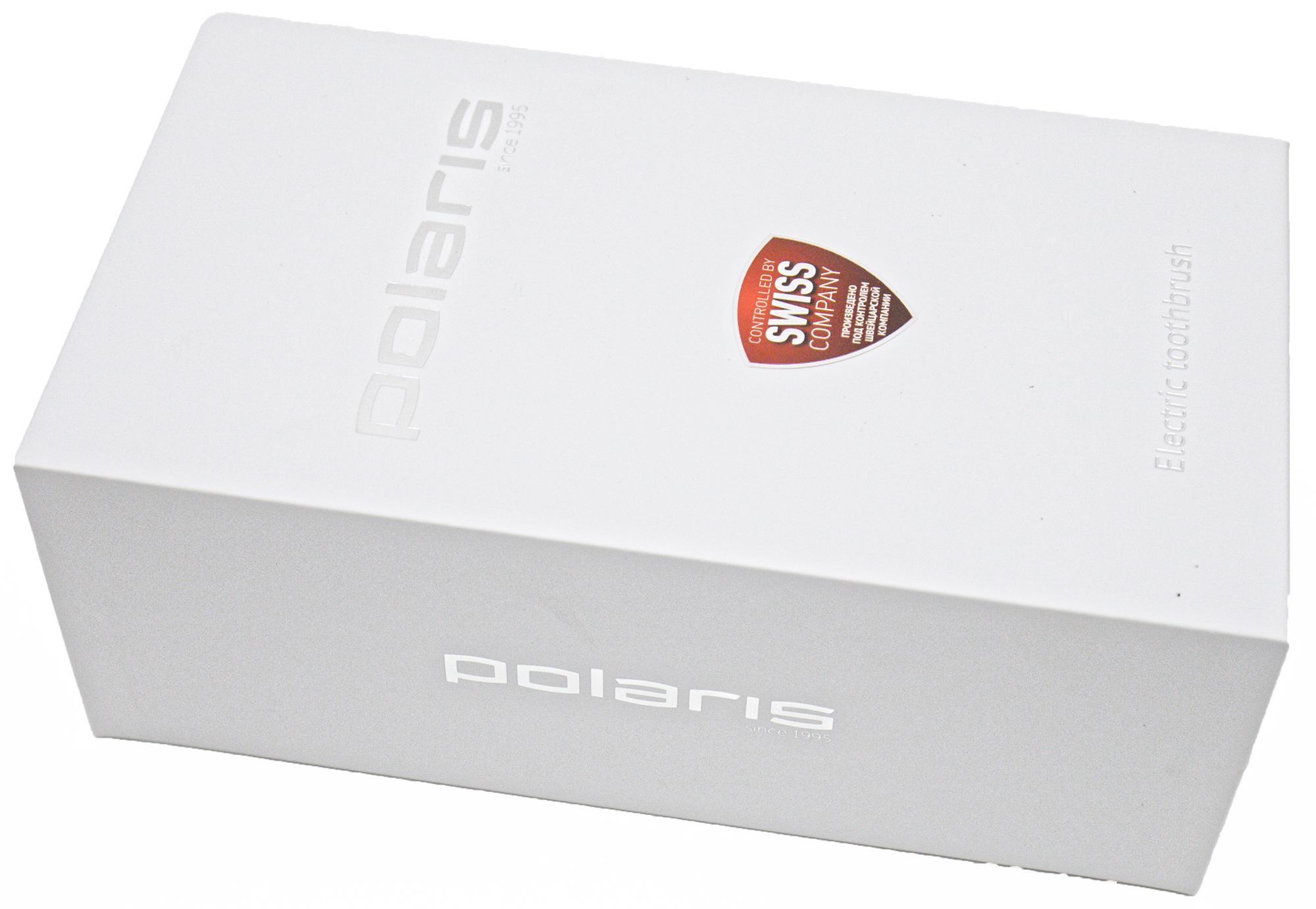 Крышка коробки из белого матового картона украшена логотипом компании (золотые буквы) и лейблом «Контролируется швейцарской компанией». Внизу на ней более мелкими, но тоже золотыми литерами выбито название прибора на английском.