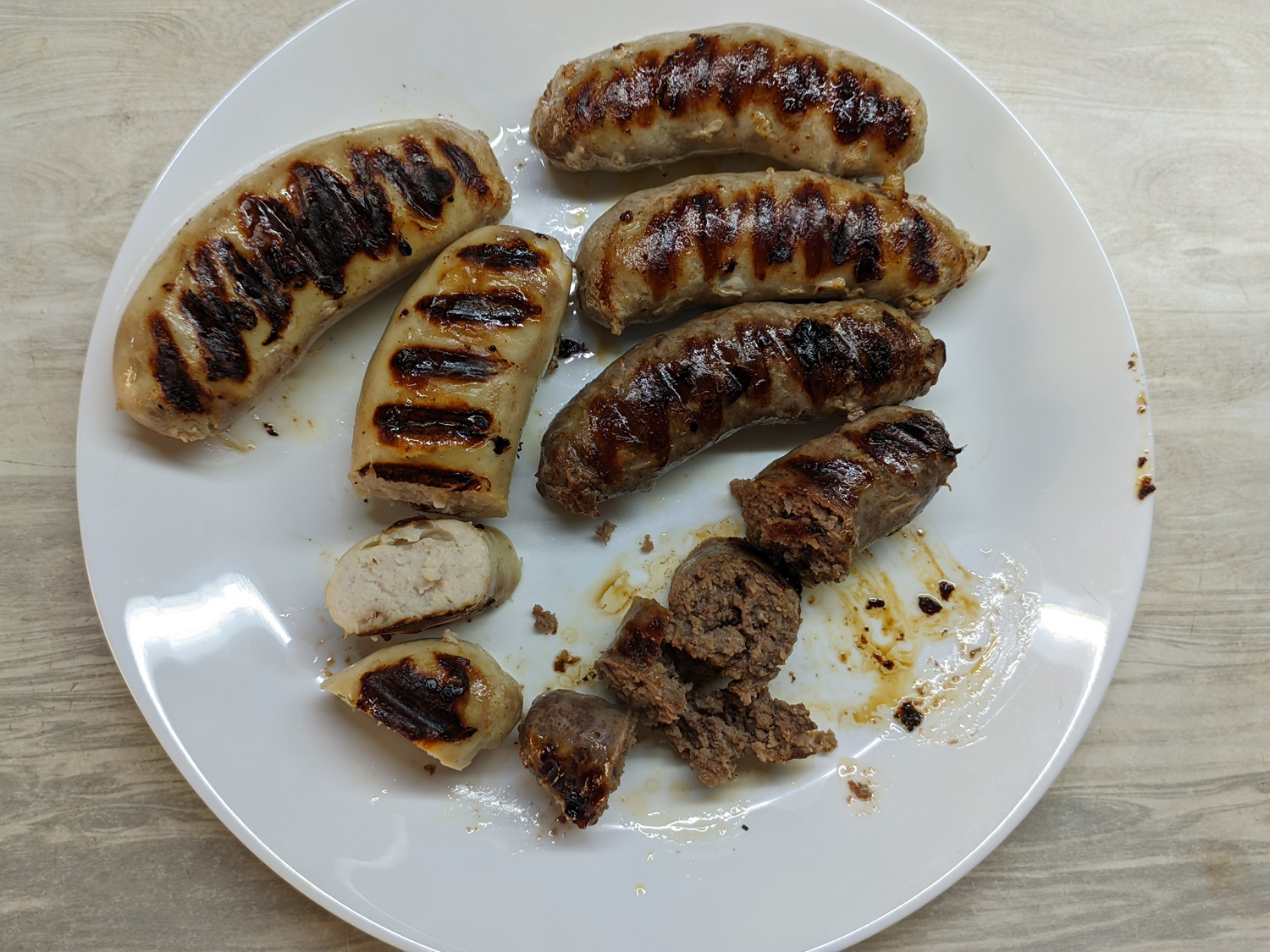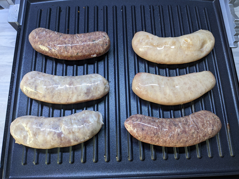 Колбаски, согласно инструкции, нужно готовить на средней температуре, переворачивая каждые четыре минуты (всего их нужно перевернуть четыре раза). В нашем распоряжении оказались говяжьи и куриные колбаски. Посмотрим, как они приготовятся в таком режиме.