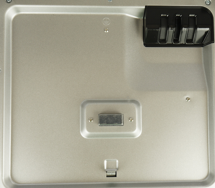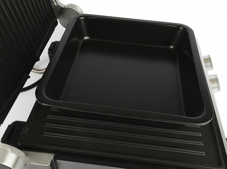 Сбоку располагается выдвигающийся по диагонали съемный лоток для жира. Такое решение также является более удобным, чем лоток, выдвигающийся сзади.