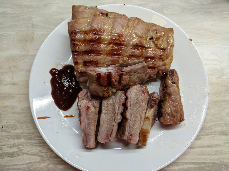 Следующий тест — свиные ребра. Прилагаемая книга рецептов рекомендует мариновать ребра в течение 30 минут в смеси соуса терияки, сладкой паприки, соли и черного молотого перца, после чего готовить 5 минут при температуре 180 °C.