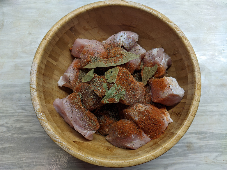Согласно еще одному рецепту из прилагаемой книги, свинину нужно нарезать на кубики со стороной 4 сантиметра, после чего замариновать с растительным маслом, молотой сладкой паприкой, черным перцем, солью, лавровыми листом и уксусом (уксус мы решили не добавлять — зачем портить мясо?).