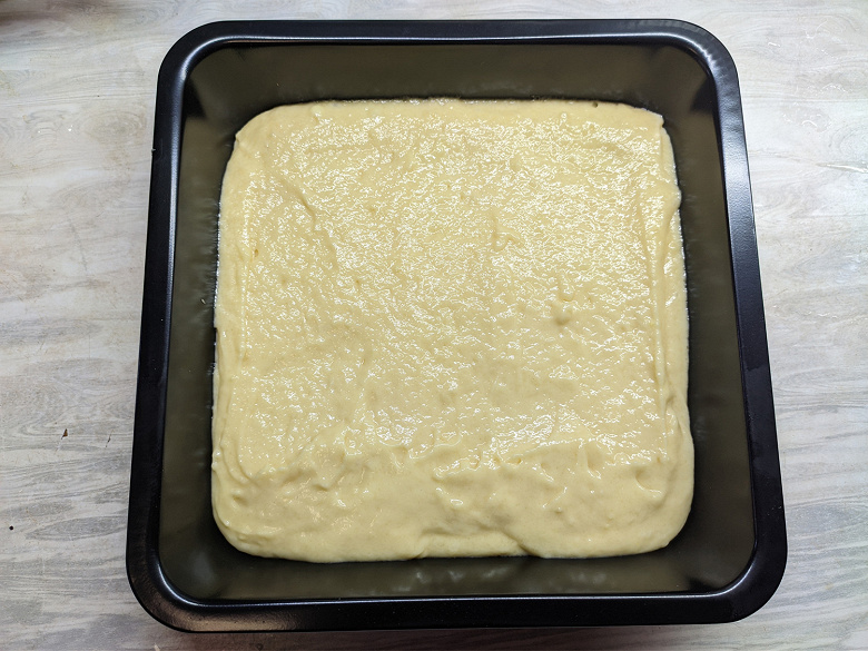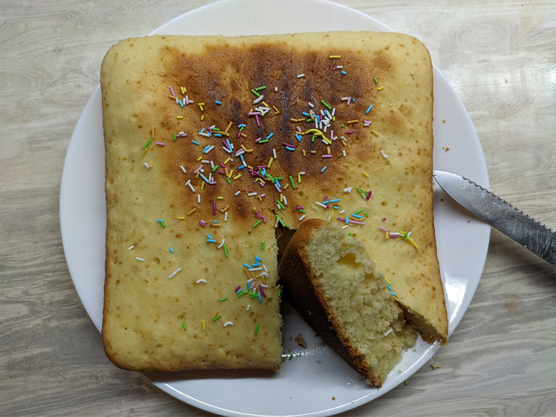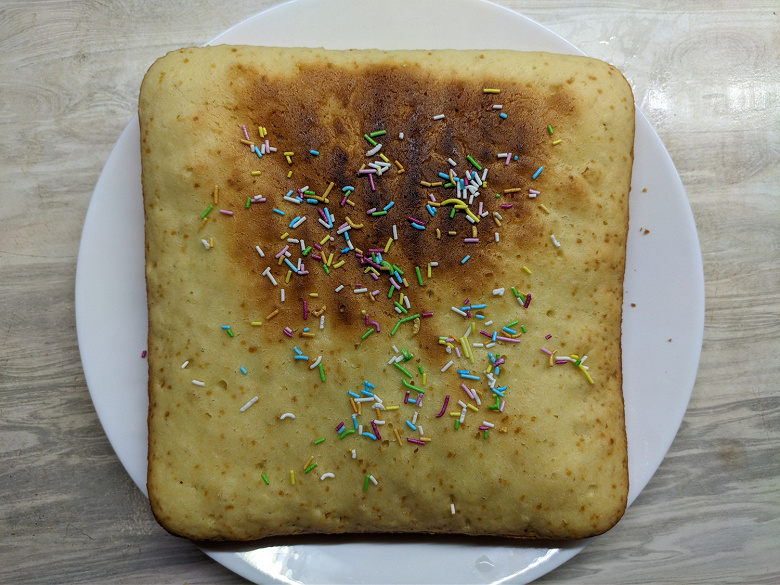 Результат оказался весьма неплох. Несмотря на то, что дальний край явно пропекся чуть лучше, кекс оказался полностью готовым и пропеченным. Без сырых участков теста и без подгоревших корочек.