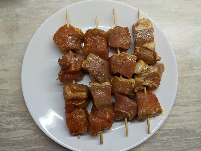 Затем мясо нужно нанизать на деревянные шпажки и жарить 4 минуты при температуре 180 °C.