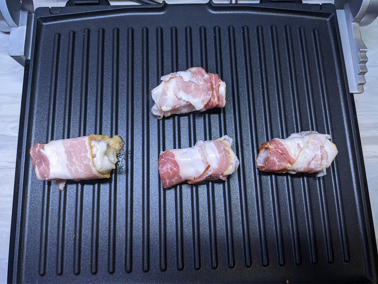 Выкладываем на гриль и жарим 4 минуты при температуре 150 °C (минимальный температурный режим).