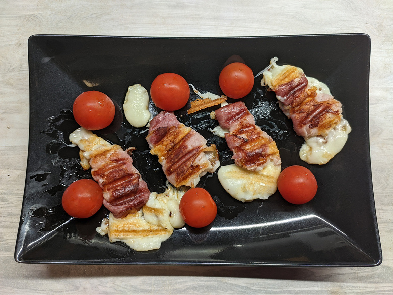 Быстрая и простая закуска — бекон с сыром сулугуни.