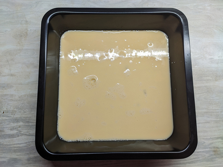 Второй эксперимент с формой — приготовление омлета. Мы взяли три яйца, добавили соответствующий им объем молока, слегка взбили смесь, перелили ее в форму, накрыли фольгой и поставили в гриль, разогретый до минимальной температуры.