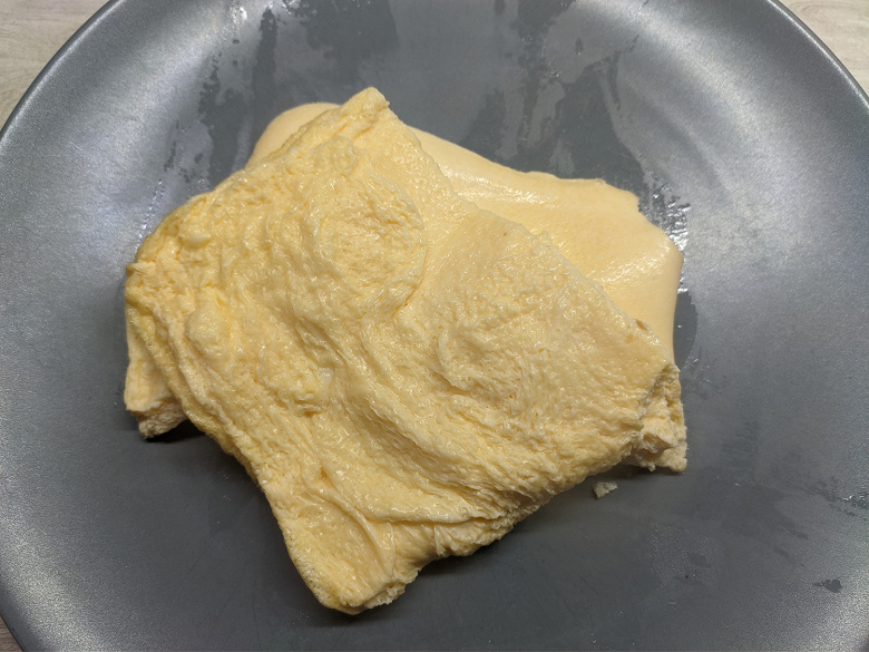Такой омлет готовится очень быстро — буквально за 4-5 минут. По истечении этого времени мы получили воздушный и нежный омлет, который отделился от формы без каких-либо проблем.