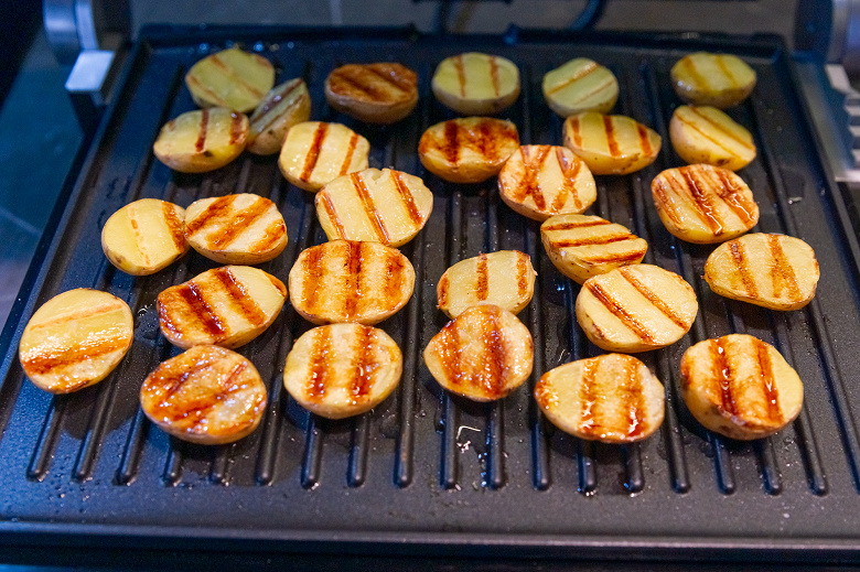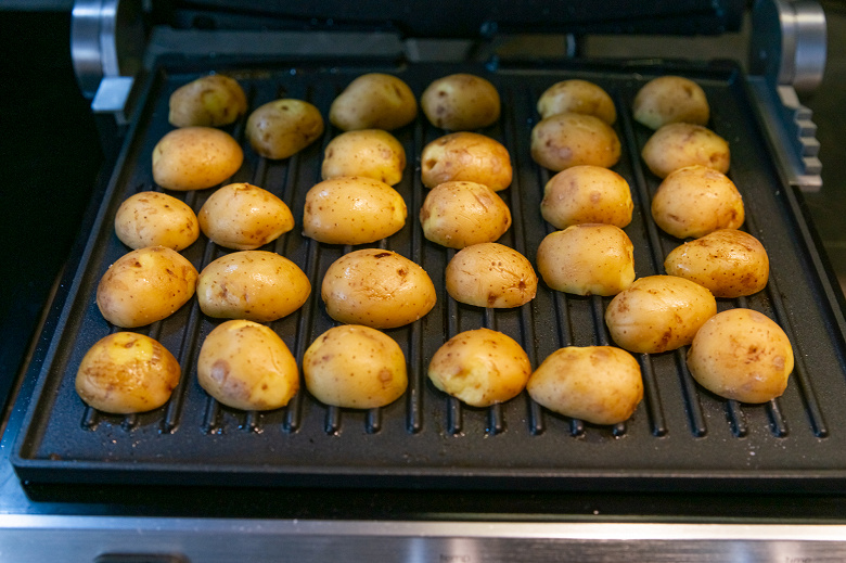 Затем слегка подрумянили половинки булочек на 180 °C в течение трех минут на первой высоте крышки. В режиме прижимного гриля сделать это было бы невозможно — булочки бы попросту сплющились. В ходе теста заметили одну особенность: крышка не фиксируется горизонтально, она сильнее надавливает на половинки булочек, лежащие в глубине, ближе к дальнему краю. Поэтому если нужно приготовить нежные продукты, которые нельзя сдавливать, то нужно устанавливать более высокий зазор между панелями и размещать кусочки ближе к наружному краю гриля.