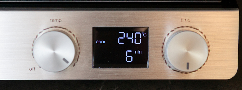 На уровне нагрева в 230 или 240 °C сначала высветится надпись sear, это минутный режим нагрева на самом максимуме, что позволяет при обжарке стейков, например, «запечатать» мясо и не дать соку вытечь.
