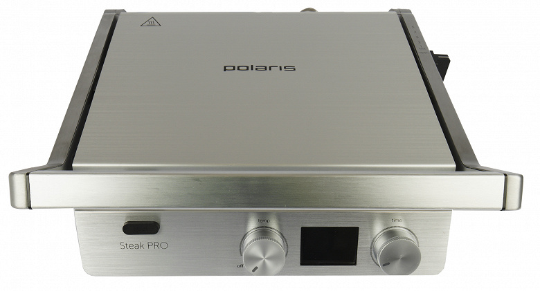 Корпус прижимного гриля Polaris PGP 3005 почти полностью покрыт матовым серебристым металлом светлого оттенка. Нижние боковые части корпуса, как и некоторые элементы управления — из черного пластика. Устройство выглядит очень аккуратно, стильно и солидно — ничего лишнего. Материалы корпуса весьма приятны тактильно.