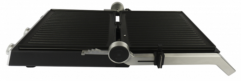 При нажатии на большую кнопку справа, можно раскрыть панели в режиме барбекю на 180°. В полностью разложенном виде ручка служит опорой для верхней панели.