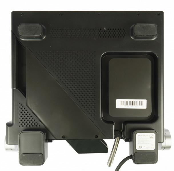 На дне гриля находятся вентиляционные отверстия, четыре ножки с противоскользящими накладками, отсек для намотки шнура и наклейка с технической информацией.