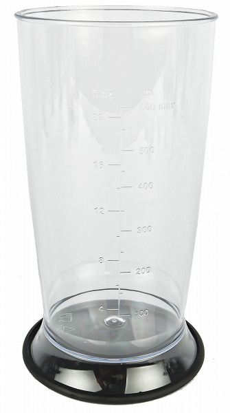 Большая чаша тоже изготовлена из прозрачного пластика. Основание емкости оснащено резиновым кольцом, улучшающим сцепление с поверхностью стола. На стенках чаши две шкалы: в унциях и миллилитрах (от 250 до 2000 мл).