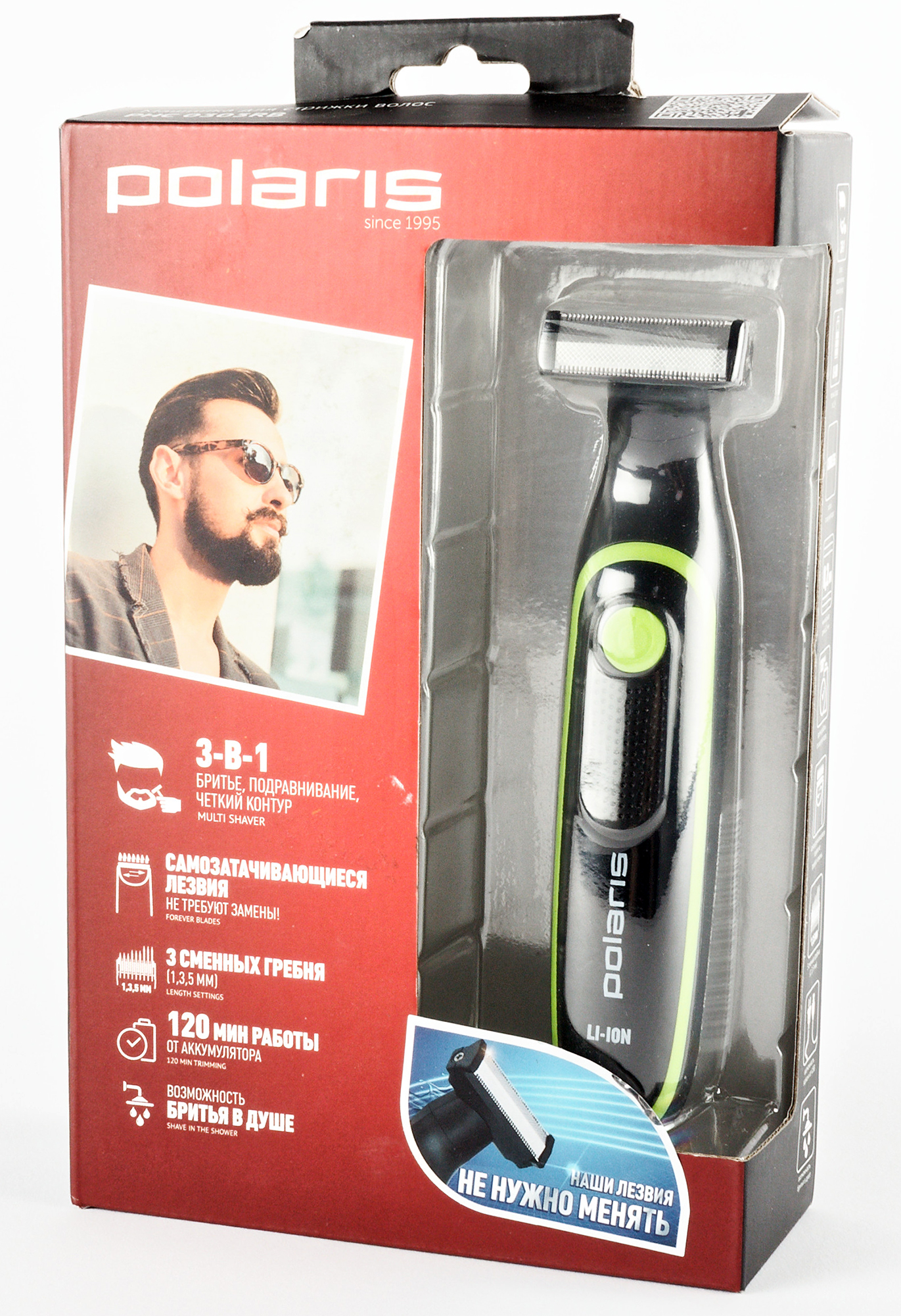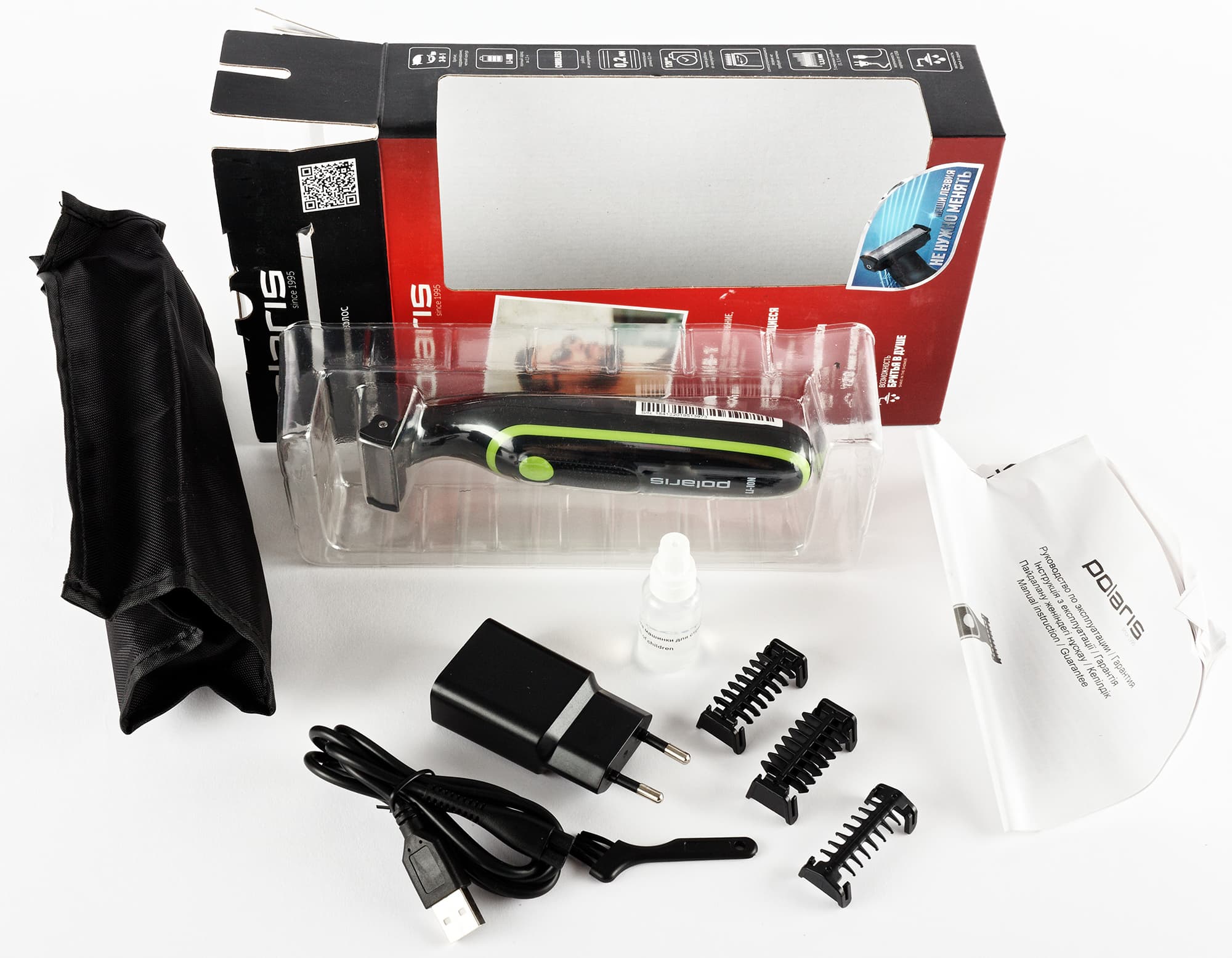 Polaris PHC 0303RB позиционируется производителем как «машинка для стрижки волос». При этом при первом знакомстве перед нами предстает аккумуляторный мини-триммер с тремя насадками для волос разной длины, а по информации на упаковке прибор подходит не только для подравнивания волос и формирования четких контуров, но также может выполнять функцию бритья.
