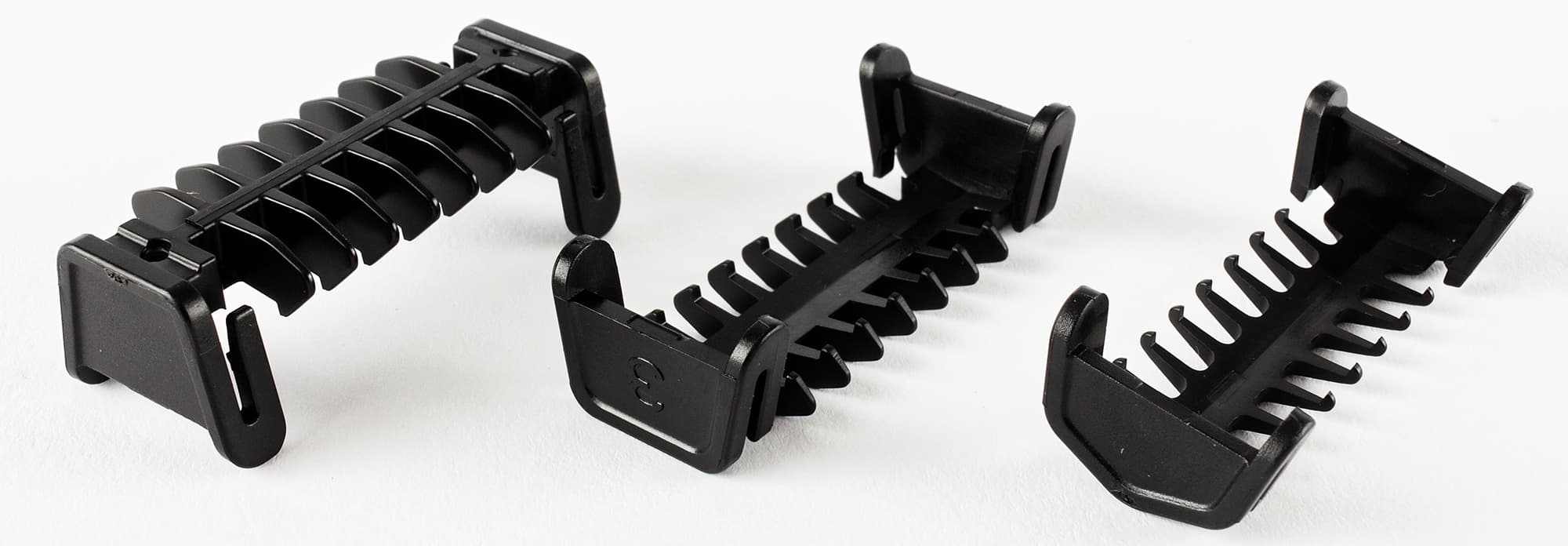 Смотрится триммер довольно стандартно: перед нами устройство для стрижки с тремя насадками различной длины и двумя рабочими ножами.