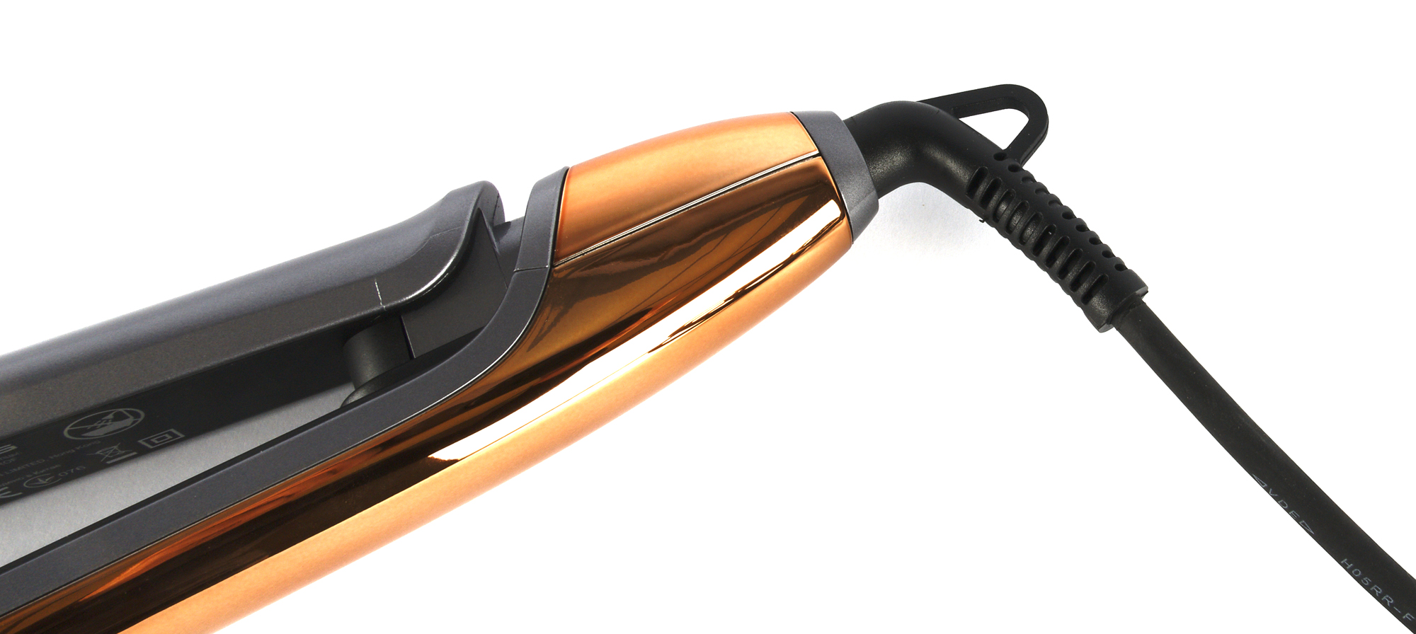 Корпус прибора изготовлен из серого и медного пластика. Сборка выглядит качественно, а сам выпрямитель — лаконично. Стайлер не тяжелый и удобно лежит в руке. У него стандартный размер — 29 см в длину и 4 см в ширину.