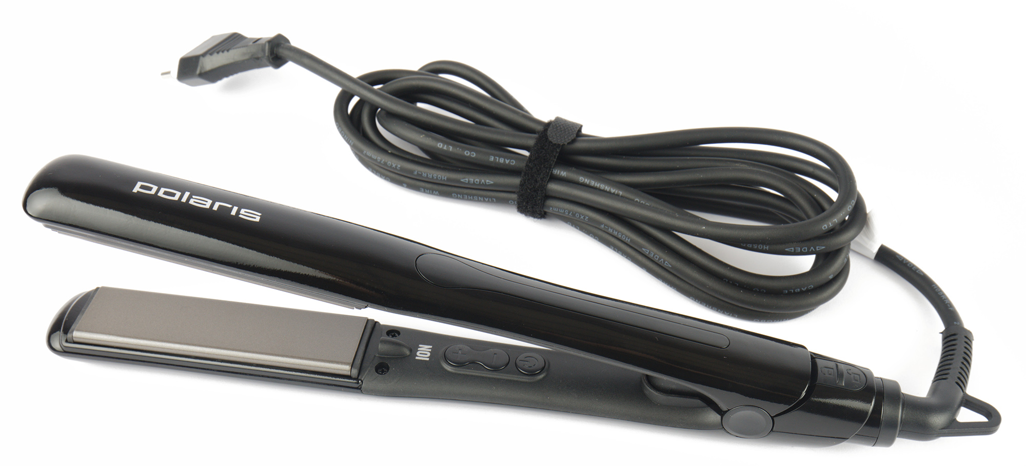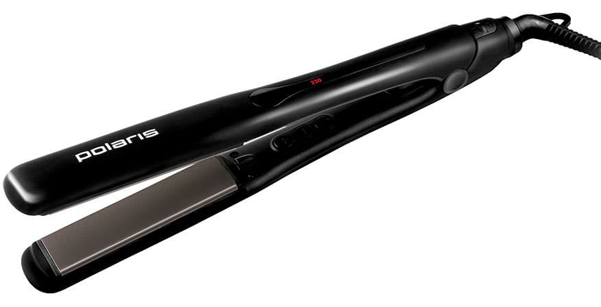Корпус Polaris PHSS 2595TAi, выполненный из глянцевого пластика черного цвета, выглядит сдержанно и стильно. Прибор удобно держать в руке, он немного весит и имеет стандартный, небольшой размер — 29 см в длину. Размер рабочих панелей (2,7×9,5 см) выглядит достаточным для того, чтобы эффективно уложить волосы любой густоты.
