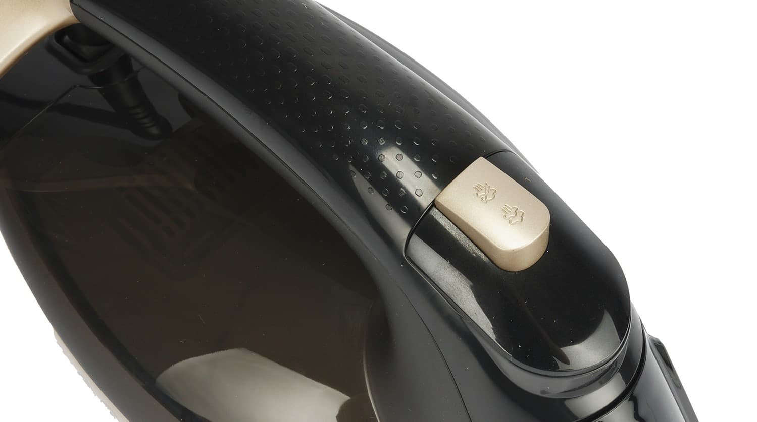 Держать утюг комфортно, он не очень тяжелый — 1,15 кг без учета шнура. С обеих сторон ручка сделана из глянцевого пластика, а сверху пластик имеет объемный рисунок из точек, это место попадает точно под ладонь и позволяет утюгу надежно держаться в руке.