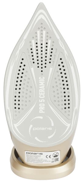 Подошва устройства выполнена из нержавеющей стали и имеет качественное керамическое покрытие. Поверхность подошвы на ощупь гладкая. На ней отштампованы углубления для быстрого проглаживания вещей во всех направлениях, без прилипания утюга к ткани. Отверстия для выхода пара расположены в центральной части, а также двумя рядами по бокам.