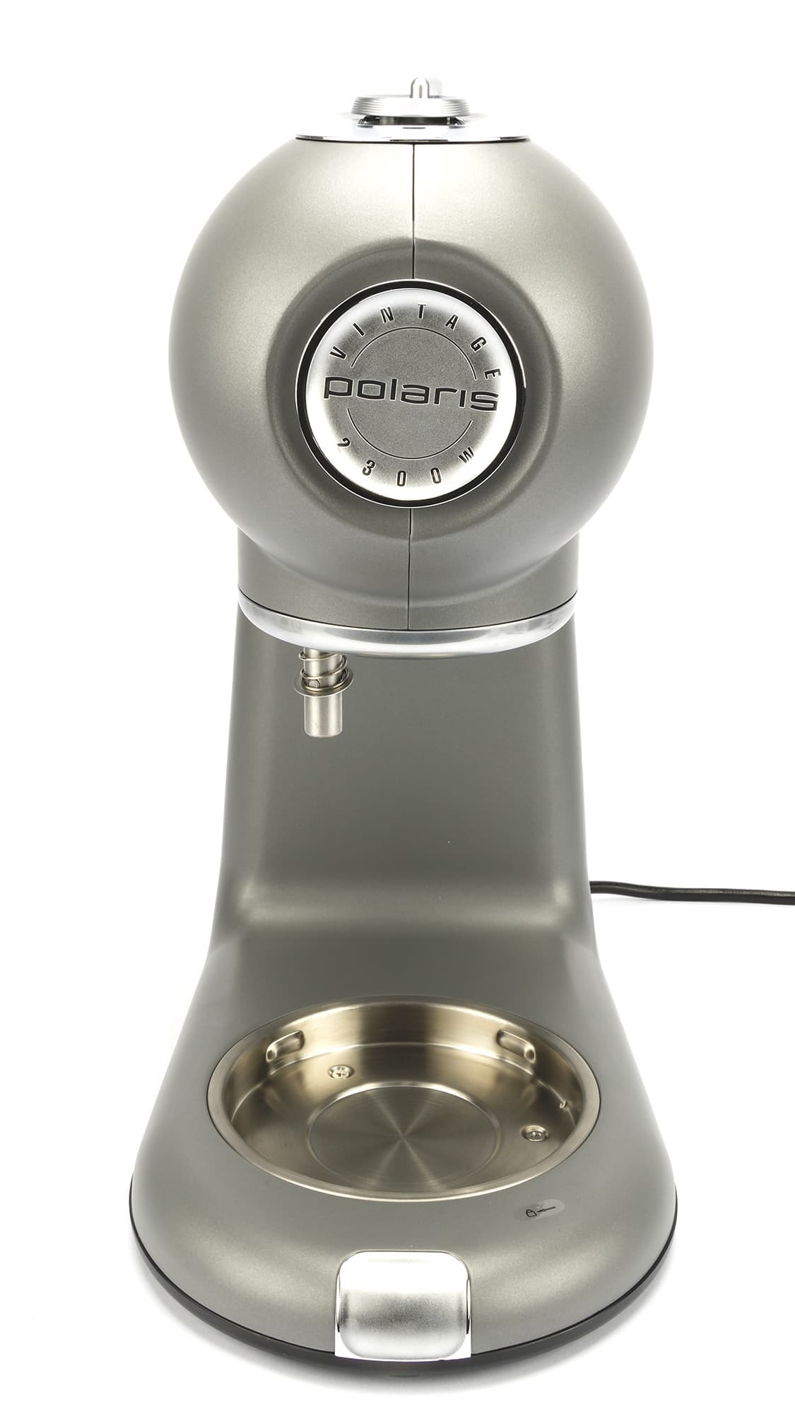Тяжелый серебряный корпус Polaris 2203L совсем не выглядит массивным засчет скругленных углов и тонкой ножки, соединяющей моторный блок с подошвой. Выполнен он из приятного на ощупь матового, чуть шершавого металла. Гнезда для мясорубки и блендера надежно закрыты заглушками. Круглая сенсорная панель управления слегка выступает.