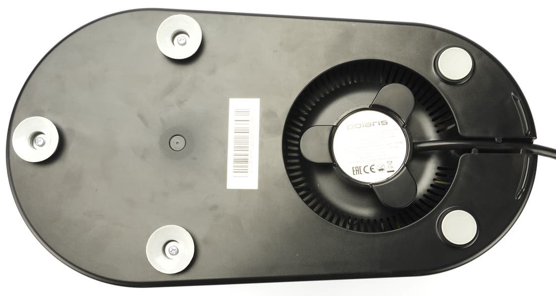 Дно корпуса оборудовано тремя присосками и двумя резиновыми ножками, назначение которых — гасить вибрации при работе. Здесь же мы видим наклейку со штрих-кодом и шильдик с краткой технической информацией о приборе.