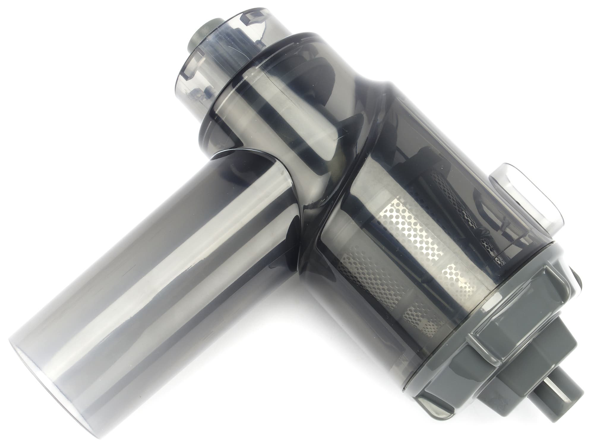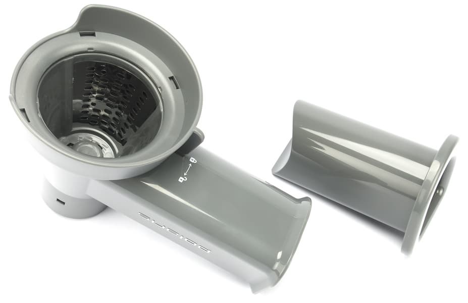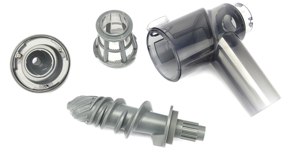 Разобрав соковыжималку, мы видим всего четыре детали — корпус, шнек из противоударного пластика, металлический фильтр-сетку в пластиковом основании и крышку с выходом для отходов.
