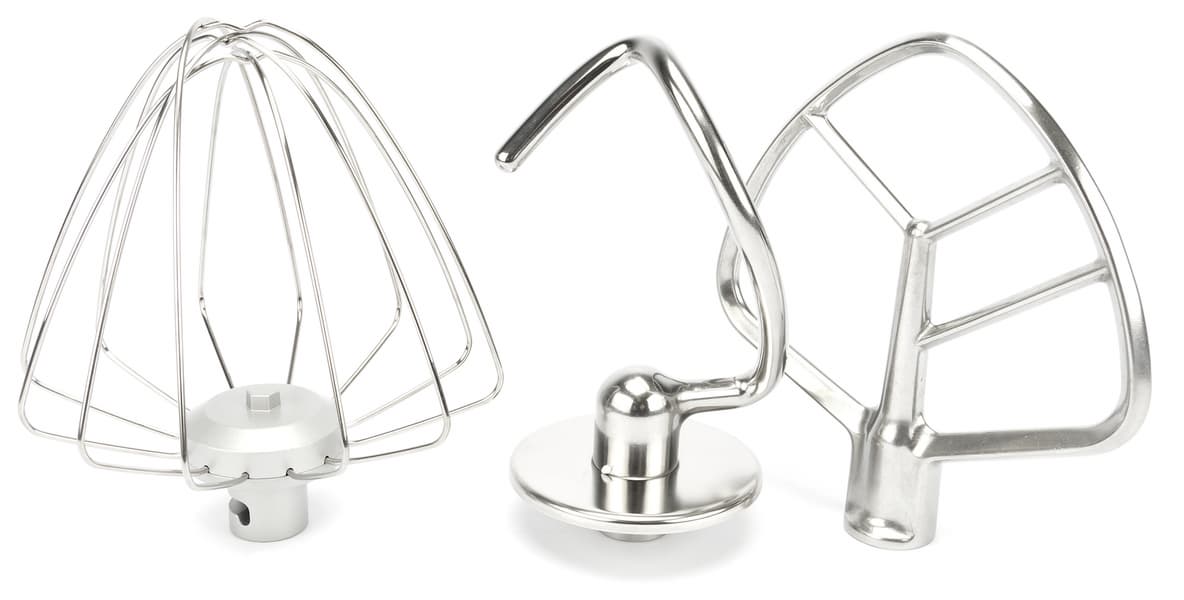 Комплект насадок для планетарного миксера состоит из венчика для взбивания, лопатки для смешивания и крюка для замешивания тугого теста. Крюк и лопатка целиком железные, а вот у венчика основание пластиковое.