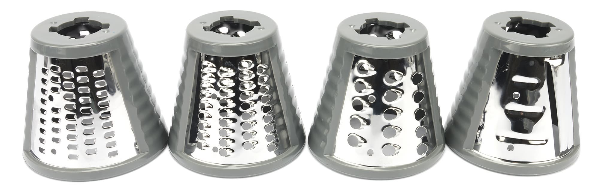 Конусообразные терки выполнены из металла. В комплекте: крупная терка, малая, для драников и шинковка. В блок терки просто вставляются и цепляются в глубине небольшим поворотом за специальные выступы. Чтобы вынуть терку, надо чуть повернуть ее против часовой стрелки и потянуть на себя.