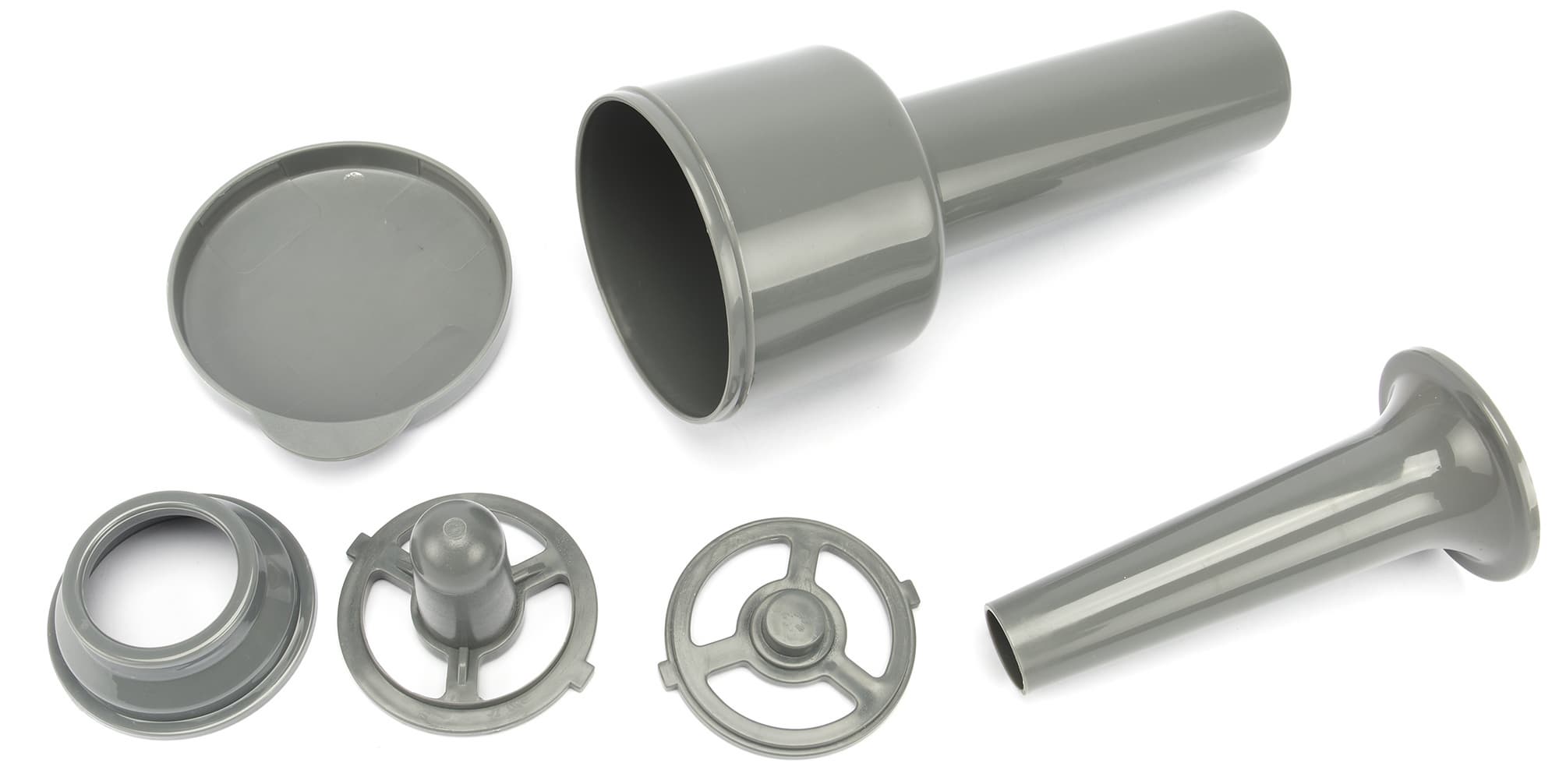 Толкатель пластиковый, как и аксессуары: насадка для изготовления колбас и кеббе. Диаметр отверстия насадки для колбасок на выходе — 1,7 см. Корпус толкателя одновременно служит и контейнером для хранения мелких деталей.