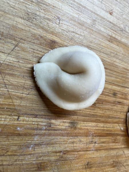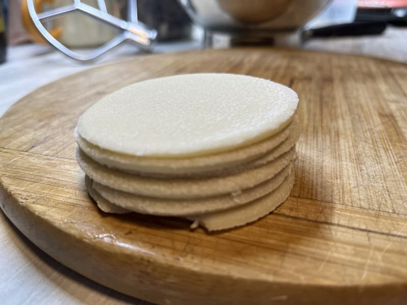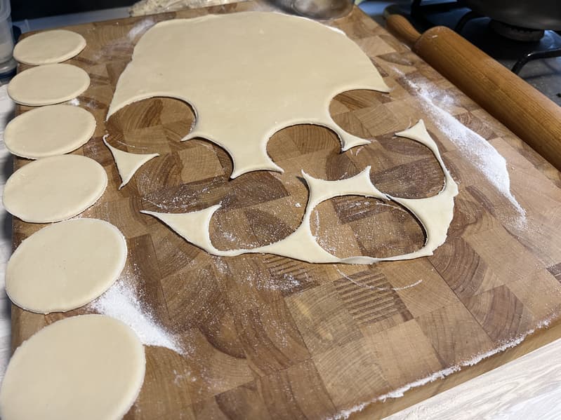 После чего тонко раскатали и вырезали кружки для будущих пельменей.