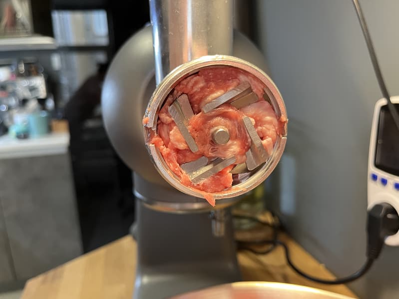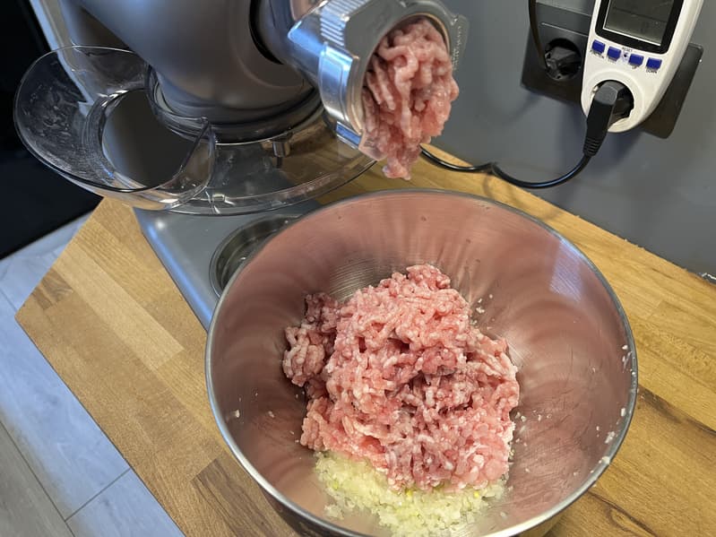 Установили на мясорубку насадку для кеббе и принялись за изготовление оболочки для котлеток.